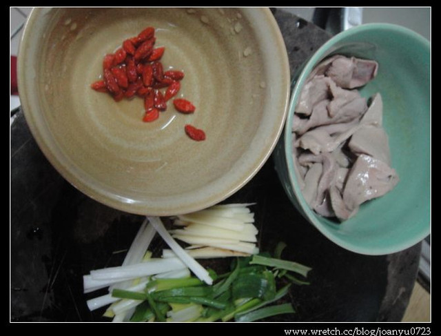 材料:豬肝,蔥1根薑3片,枸杞少許 調味料:鹽和雞粉一小匙 酒一湯匙