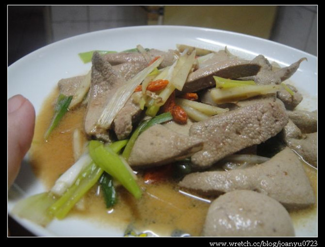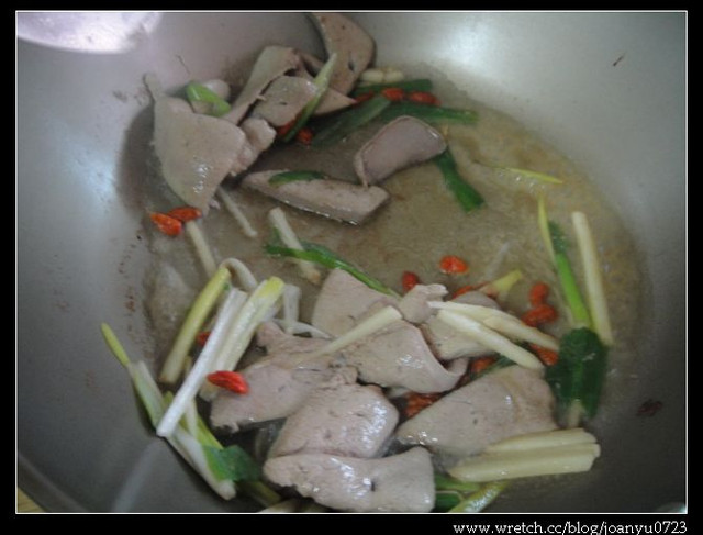 2.蔥薑下鍋爆香加入豬肝和枸杞以及少許水,煮一下最後加入米酒鹽雞粉等調味料就可以了.