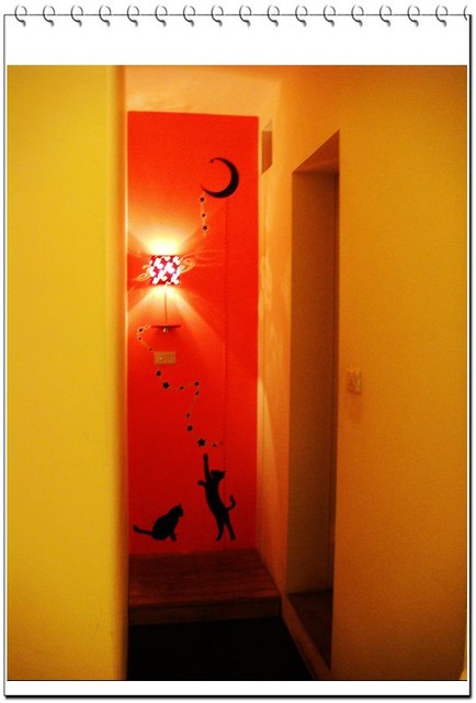 右邊是廁所,這樣一個小角落貼上個遊戲中的小貓咪,再裝飾個有風格的壁燈,好可愛.......讓這個角落豐富起來了