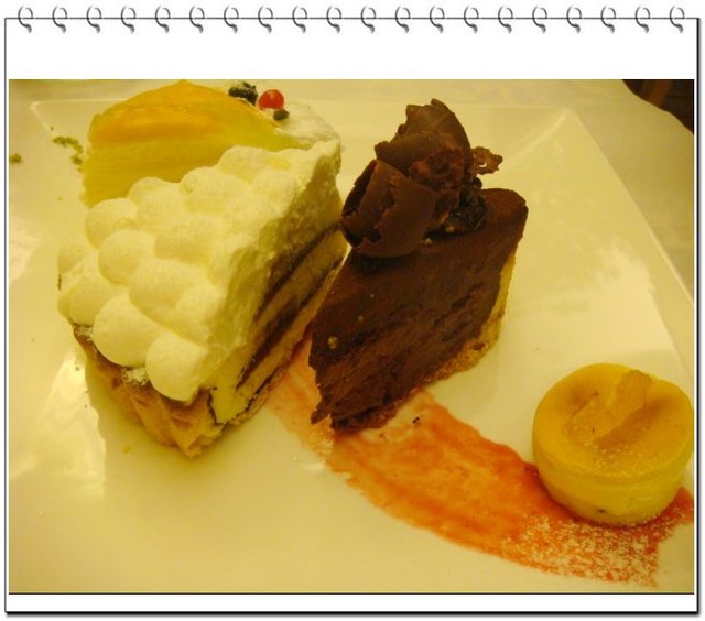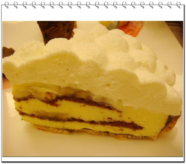 蛋糕裡面夾著香蕉,最上一層厚厚的像釋迦頭的奶油.新鮮的蛋糕,酥酥的塔皮搭配上香蕉的香甜.上面的奶油不甜膩的口感吃多了也不覺得膩.