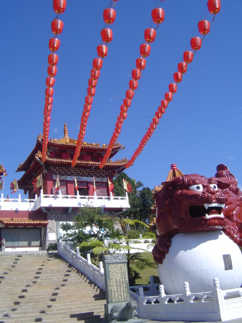 文武廟是在日月潭的行程中的第一站,剛好就面對著日月潭而後有群山,沿著寺廟附近處處可見的櫻花更顯出文武廟的山水之美.在廟門口就可以看到左右有兩座石雕巨獅,襯出整座寺廟的雄偉;簡介上寫是新光集團老家長吳火獅先生捐贈。此巨獅不僅全台所僅有更是文武廟最大的特色。